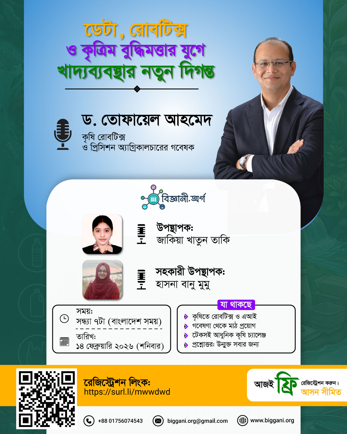 এই প্রেক্ষাপটে বিজ্ঞান ও গবেষণাভিত্তিক প্ল্যাটফর্ম biggani.org আয়োজন করতে যাচ্ছে ড. তোফায়েল আহমেদের সঙ্গে একটি বিশেষ অনলাইন সাক্ষাৎকার। সাক্ষাৎকারটি অনুষ্ঠিত হবে ১৪ ফেব্রুয়ারি, রাত ৭টা (বাংলাদেশ সময়)। এই আলোচনায় উঠে আসবে আধুনিক কৃষির ভবিষ্যৎ, প্রযুক্তিনির্ভর কৃষি ব্যবস্থার বাস্তব চ্যালেঞ্জ, গবেষণাগারের উদ্ভাবন কীভাবে মাঠপর্যায়ে কৃষকের কাজে লাগতে পারে, এবং উন্নয়নশীল দেশের প্রেক্ষাপটে বিজ্ঞানভিত্তিক কৃষি কেন সময়ের দাবি।