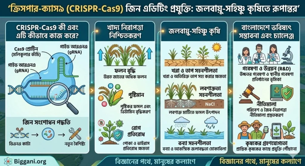 চিত্র-১: CRISPR-Cas9-জিন সম্পাদনার মাধ্যমে জলবায়ু-সহিষ্ণু কৃষি ও খাদ্য নিরাপত্তার কাল্পনিক রূপরেখা