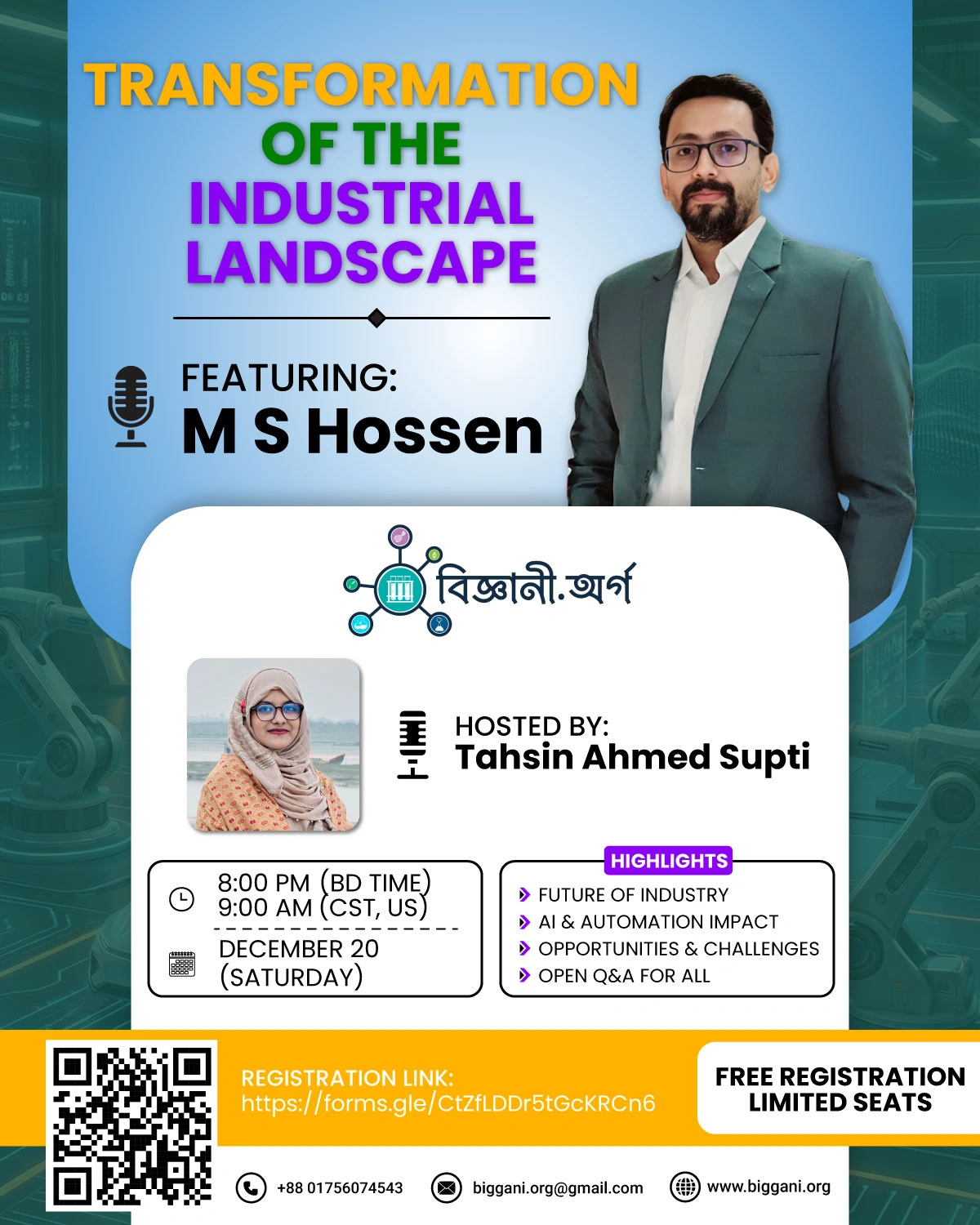 বিজ্ঞানী অর্গ (Biggani.org) আয়োজন করতে যাচ্ছে শিল্পের বর্তমান ও ভবিষ্যৎ প্রেক্ষাপট নিয়ে একটি বিশেষ সেশন। বর্তমান যুগে প্রযুক্তির ছোঁয়ায় কীভাবে আমাদের শিল্পক্ষেত্রগুলো বদলে যাচ্ছে এবং কৃত্রিম বুদ্ধিমত্তা (AI) ও অটোমেশন সেখানে কী প্রভাব ফেলছে—এসব নিয়েই হবে বিস্তারিত আলোচনা।