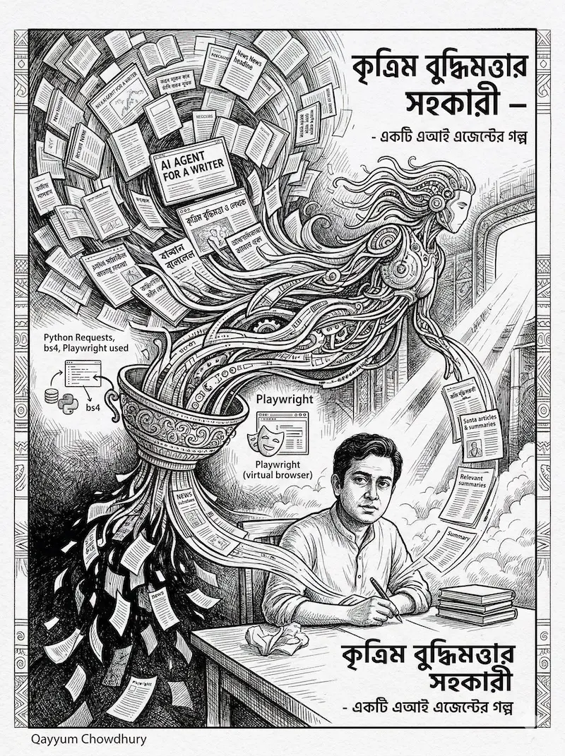 আমি নিজেও এই ধারণাকে কাজে লাগিয়ে একটি ছোট কিন্তু কার্যকর AI agent তৈরি করেছি, যার মূল কাজ হচ্ছে আমার জন্য প্রাসঙ্গিক আর্টিকেল বা লেখা খুঁজে বের করা। একজন কলাম বা অপ-এড লেখক হিসেবে আমার প্রতিদিনই জানতে হয়—বিশ্বে বা বিশেষ করে বাংলা ভাষায়—কোন কোন বিষয় নিয়ে লেখা হচ্ছে, কোন বিষয়গুলো এখন আলোচনার কেন্দ্রে, এবং অন্যান্য লেখকরা কী ধরনের দৃষ্টিভঙ্গি তুলে ধরছেন। কিন্তু বাস্তবতা হলো, প্রতিদিন ঘণ্টার পর ঘণ্টা ধরে বিভিন্ন ওয়েবসাইট ঘেঁটে এই তথ্য সংগ্রহ করা অত্যন্ত সময়সাপেক্ষ এবং ক্লান্তিকর।
